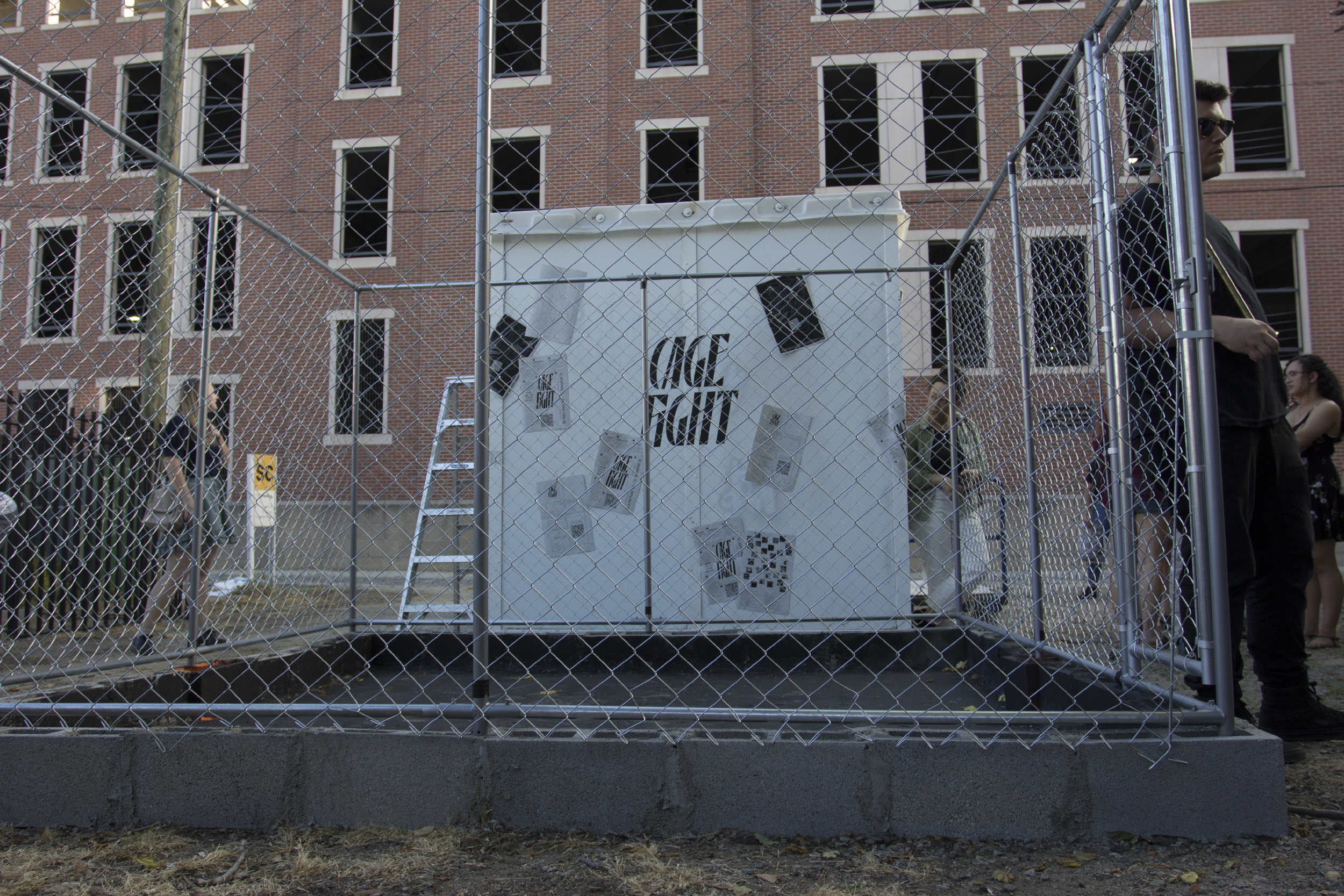 An installation and performance on the romanticization of violence as a method of coping or healing (revenge). “Cage Fight” is promoted as an underground event, hidden in the parking lot behind a school building, where individuals challenge their adversary to a fight with their own terms and design. Performers and fighters: Rin Kim, Wes Ley. 2019.