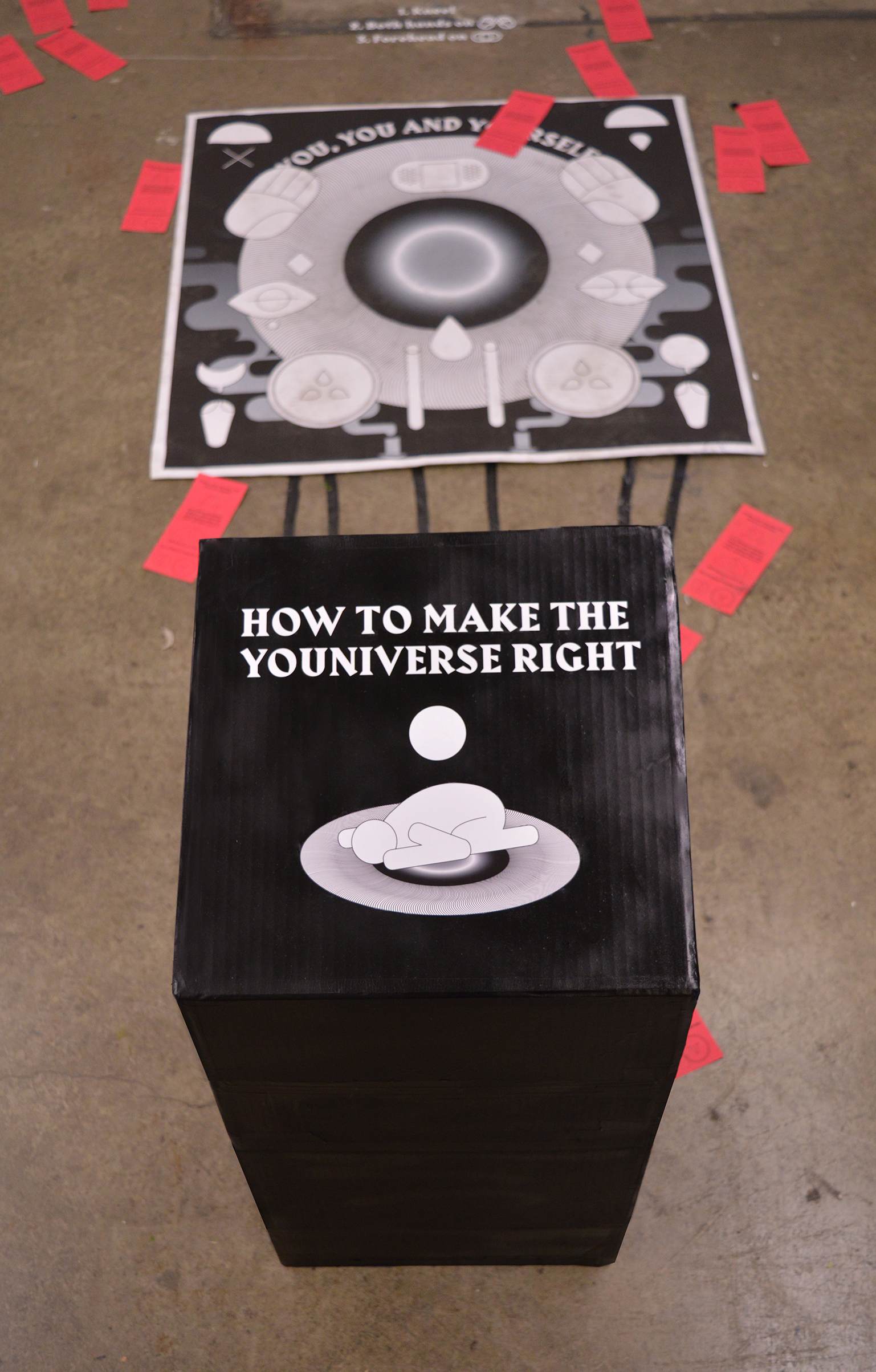 An interactive installation to initiate a spiritual healing ritual for its users. When the user kneel and kowtow on the praying mat (using the graphics on it as a guide), the projected image of their avatar will trigger a healing process animation. Talismans are available to users as takeaways. 2018.